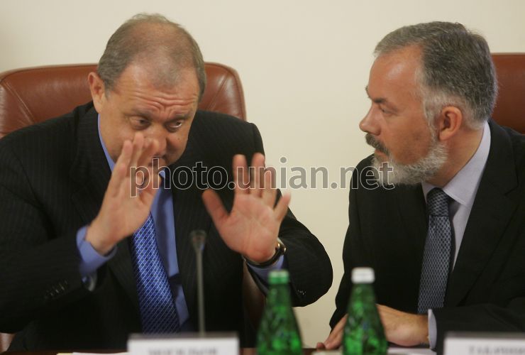 Міністр внутрішніх справ України Анатолій Могильов, ліворуч, та міністр освіти і науки України Дмитро Табачник під час засідання Кабінету міністрів України, в Києві, в середу, 12 травня 2010 р. В ході засідання Прем’єр-міністр України повідомив про те, що Уряд впродовж поточного року планує, щонайменше, п’ять разів підвищувати мінімальні зарплати і посадові оклади в бюджетній сфері. При цьому він також повідомив, що на сьогоднішньому засіданні Кабмін планує ухвалити постанову, що регулює підвищення посадових окладів у бюджетній сфері, і уточнив, що, перш за все, підвищуватиметься тарифна ставка до посадового окладу для першого тарифного розряду Єдиної тарифної сітки. При цьому прем’єр-міністр зазначив, що підвищення посадових окладів буде здійснене для більш як 3,5 млн. працівників освіти, культури, охорони здоров’я, науки тощо. Фото Олександра Синиці / УНІАН