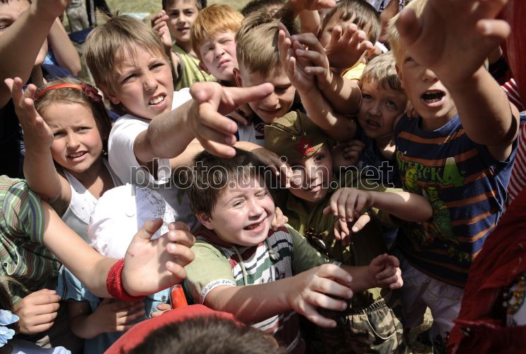 Діти змагаються у дворі будинку на одній з вулиць Севасптополя (Крим), у суботу, 5 червня 2010 р. Цього дня жителі одного з районів міста упорядкували свій двір і влаштували свято для дітей. Захід був присвячений до Дня Севастополя, який цього року припадає на 12 червня. Фото Андрія Любімова / УНІАН