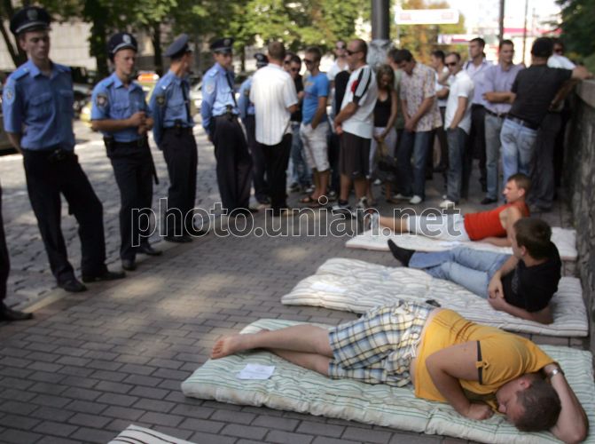 Учасники акції «Розпродаж лікарень. Дорого» лежать на матрацах біля будівлі Кабінету Міністрів України, в Києві, в середу, 7 липня 2010 р. За словами учасників, акція «Розпродаж лікарень. Дорого» присвячена спробам уряду виселити хворих СНІДом з приміщення інфекційної лікарні, яка розташована поряд з Києво-Печерською Лаврою. У цій лікарні стоять на обліку і лікуються люди зі всієї України. Фото Андрія Скакодуба / УНІАН