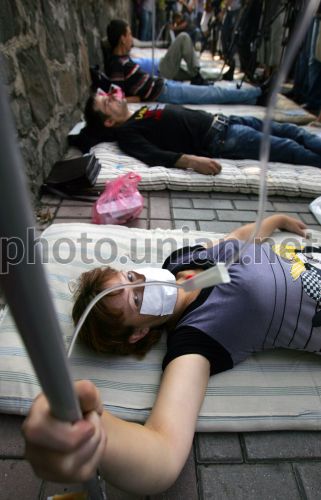 Умовний хворий лежить біля крапельниці на матраці під час акції «Розпродаж лікарень. Дорого» біля будівлі Кабінету Міністрів України, в Києві, в середу, 7 липня 2010 р. За словами учасників, акція «Розпродаж лікарень. Дорого» присвячена спробам уряду виселити хворих СНІДом з приміщення інфекційної лікарні, яка розташована поряд з Києво-Печерською Лаврою. У цій лікарні стоять на обліку і лікуються люди зі всієї України. Фото Андрія Скакодуба / УНІАН