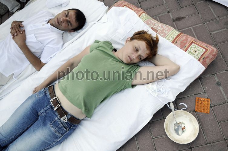 Умовні хворі лежать на матрацах під час акції «Розпродаж лікарень. Дорого», в Севастополі (Крим), в середу, 7 липня 2010 р. За словами учасників, акція «Розпродаж лікарень. Дорого» присвячена спробам уряду виселити хворих СНІДом з приміщення інфекційної лікарні, яка розташована поряд з Києво-Печерською Лаврою. У цій лікарні стоять на обліку і лікуються люди зі всієї України. Фото Андрія Любимова / УНІАН
