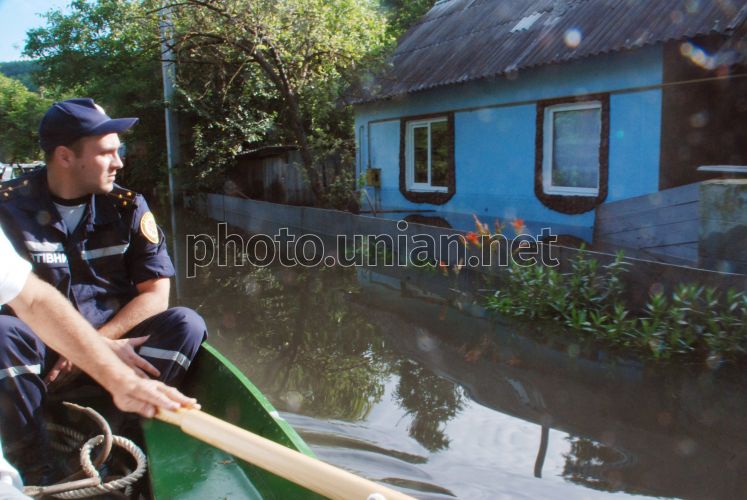 Співробітник МНС пливе на човні повз затоплені двори у с. Устечко (Тернопільська обл.), в суботу, 10 липня 2010 року. Внаслідок повені рівень води в р. Коропець та Дністер піднялися, що спричинило затоплення дворів в с. Устечко. Фото Віктора Гурняка / УНІАН