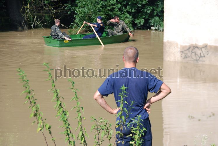 Співробітники МНС пливуть на човні повз затоплені двори у с. Устечко (Тернопільська обл.), в суботу, 10 липня 2010 року. Внаслідок повені рівень води в р. Коропець та Дністер піднялися, що спричинило затоплення дворів в с. Устечко. Фото Віктора Гурняка / УНІАН