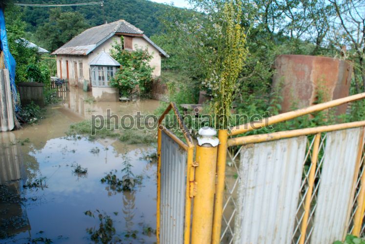 Затоплений двір в с. Устечко (Тернопільська обл.), в суботу, 10 липня 2010 року. Внаслідок повені рівень води в р. Коропець та Дністер піднялися, що спричинило затоплення дворів в с. Устечко. Фото Віктора Гурняка / УНІАН