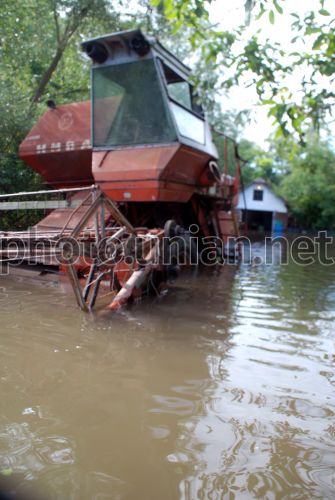 Комбайн стоїть на затопленій вулиці, в с. Устечко (Тернопільська обл.), в суботу, 10 липня 2010 року. Внаслідок повені рівень води в р. Коропець та Дністер піднялися, що спричинило затоплення дворів в с. Устечко. Фото Віктора Гурняка / УНІАН
