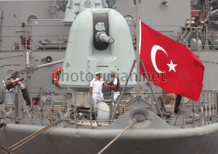 Члени команди військового судна F240 Yavuz Військово-морського флоту Турції на борту корабля в Одесі, в понеділок, 12 липня 2010 р. Цього дня в Одесі відбулася урочиста церемонія відкриття українсько-американських навчань “Сі Бриз – 2010” із запрошенням інших держав. Навчання пройдуть у період з 12 по 23 липня. У навчаннях, окрім військовослужбовців України та США, беруть участь військовослужбовці Азербайджану, Бельгії, Німеччини, Греції, Грузії, Данії, Молдови, Польщі, Туреччини, Швеції та військовий спостерігач від Австрії. Фото Олексія Сувірова / УНІАН