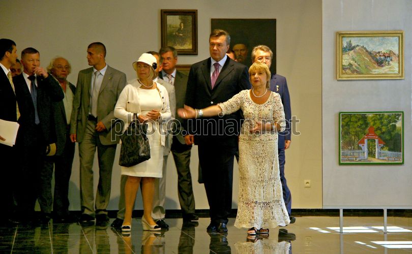 Президент України Віктор Янукович, в центрі, під час відкриття музею Тараса Шевченка, в Каневі (Черкаська обл.), у понеділок, 23 серпня 2010 р. Цього дня Віктор Янукович відкрив музей Тараса Шевченка Національного Шевченківського заповідника в рамках урочистих заходів з нагоди 19-ї річниці незалежності України. Президент України вручив державні нагороди, зокрема, ордени князя Ярослава Мудрого і ордени “За заслуги” людям, котрі зробили значний внесок до відновлення музею. Як повідомляє прес-служба Черкаської облдержадміністрації, на реконструкцію музею Тараса Шевченка в Каневі Черкаської області з державного бюджету було витрачено 66 млн. 836 тисяч гривень. Загальна вартість реконструкції музею Т.Шевченко і Національного Шевченківського заповідника - 96 млн. 452 тис. грн. Фото Олександра Синиці / УНІАН