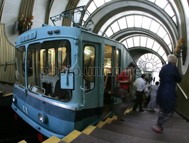 Люди виходять з фунікулеру, в Києві, у понеділок, 30 серпня 2010 р. Київський фунікулер тимчасово закривають для профілактичного ремонту. Фунікулер не працюватиме з 1 вересня по 1 жовтня 2010 року. Планові роботи на фунікулері повинні виконати протягом місяця КП «Київпастранс». Йдеться про обстеження і профілактичний ремонт. Регламентні і ремонтні роботи на фунікулері виконуються щорічно для забезпечення його подальшої надійної експлуатації. Фото Андрія Скакодуба / УНІАН