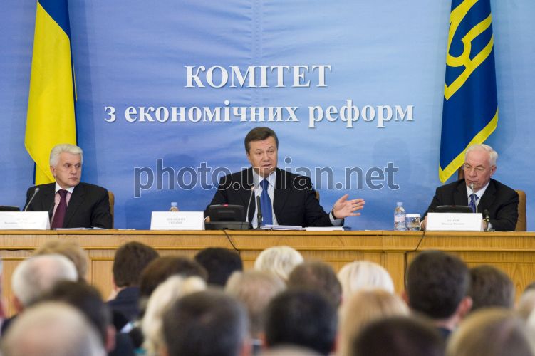 Зліва направо: голова Верховної Ради України Володимир Литвин, Президент України Віктор Янукович та прем’єр-міністр України Микола Азаров під час засідання Комітету з економічних реформ, в Києві, у вівторок, 28 вересня 2010 р. В ході засідання Президент України висловив думку, що протидія з боку чиновників є головною причиною незадовільного просування реформ e державі, зокрема, у сфері спрощення державної регуляторної політики. Фото Анастасії Сироткіної / POOL / УНІАН