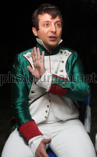 Актор ”Студії квартал 95” Володимир Зеленський в ролі Наполеона під час зйомок 3D-комедії російського режисера Марюса Вайсберга «Ржевський проти Наполеона», в Києві, у понеділок, 27 вересня 2010 р. «Ржевський проти Наполеона» - це сатирична комедія про вторгнення Наполеона до Росії в 1812 році і про те, як на плечі поручника Ржевського, переодягнутого в жіноче плаття, лягло завдання зупинити велелюбного Наполеона. Планується, що у прокат картина вийде влітку 2011 року. Фото Володимира Гонтара / УНІАН