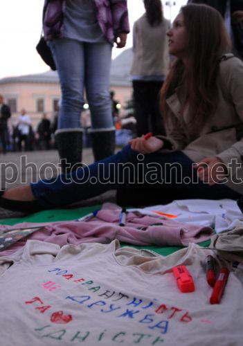 Учасниці акції ”Запали ліхтарик толерантності” розмальовують футболки на одній з вулиць в Києві, в неділю, 14 листопада 2010 р. Мета акції - проінформувати громадськість про цінність толерантності і багатокультурного суспільства. Під час акції пройшли творчі конкурси для дітей і молоді, танці, запалювання ліхтариків. Фото Олега Петрасюка / УНІАН