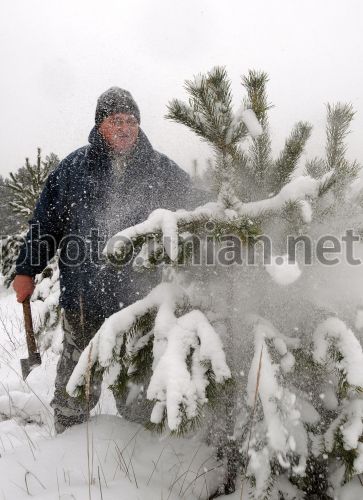 Лісник збирається рубати сосну в одному з лісництв Харківської обл., у п’ятницю, 17 грудня 2010 р. У лісництвах Харківської області сосни оптовикам почали продавати ще в листопаді. Ціни у лісників нижчі, ніж на ринках міста. Дерева до 1 метра коштують 15 грн., сосна від 1 до 2 метрів - 20 грн. На ринках ціни від 70 до 150 грн. Фото Володимира Андрєєва / УНІАН