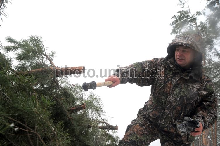 Робітник лісництва проводить таврування стовбурів сосен в одному з лісництв Харківської обл., у п’ятницю, 17 грудня 2010 р. У лісництвах Харківської області сосни оптовикам почали продавати ще в листопаді. Ціни у лісників нижчі, ніж на ринках міста. Дерева до 1 метра коштують 15 грн., сосна від 1 до 2 метрів - 20 грн. На ринках ціни від 70 до 150 грн. Фото Володимира Андрєєва / УНІАН