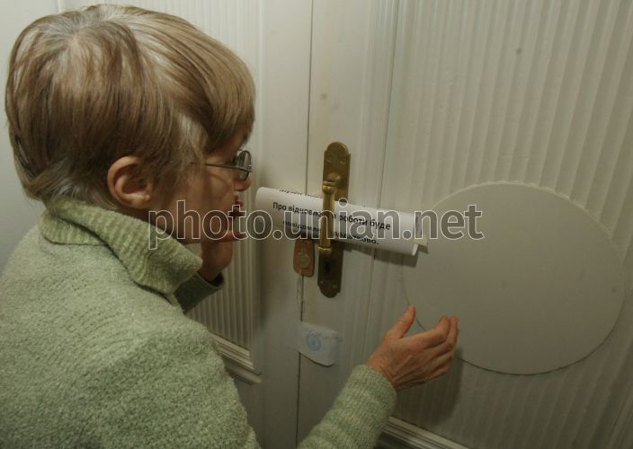 Жінка дивиться на аркуш паперу зі сповіщенням про закриття музею біля входу в приміщення музею Української Народної Республіки в Києві, у вівторок, 11 січня 2011 р. За станом на 10 січня двері музею опечатані, музей закритий. Експозиція музею розповідає про український визвольний рух початку ХХ століття: період Української Народної Республіки, Української Держави (гетьманат), період Директорії УНР і завершується подіями Першого і Другого зимового походу армії УНР. Центром експозиції є оригінал 4-го Універсала Центральної Ради, яким проголошена повна державна незалежність УНР 22 січня 1918 р. Фото Володимира Гонтара / УНІАН