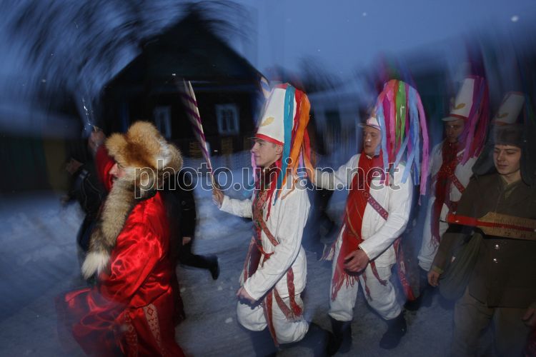 Ряджені учасники колядного карнавалу під час національного обряду ”Колядні царі” в селі Семежево (Мінська область, Білорусь), в четвер, 13 січня 2011 р. Кожен рік на Щедрий вечір в ніч з 13 на 14 січня, група з молодих чоловіків - «царів» - з піснями і танцями проходять по селу, відвідують будинки односельців і розігрують дію про Царя Максиміліана. За це господарі щедро обдаровують гостей. Цей народний обряд зародився у XVIII столітті, але зберігся лише в селі Семежево. У ньому беруть участь тільки молоді чоловіки та хлопці, яких і називають «царями». З настанням темряви ”царі” запалюють смолоскипи. Цей обряд входить до Списку нематеріальної культурної спадщини ЮНЕСКО. Фото Сергія Костіна / УНІАН