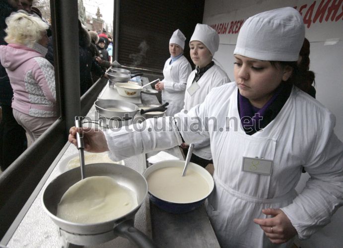 Учасниця фестивалю млинців з нагоди Масляниці готує млинці, у Севастополі (Крим), у суботу, 5 березня 2011 р. Замішували тісто, робили начинку і смажили млинці кухарі на площі перед жюрі і глядачами. Жюрі оцінювало костюми кухарів та їхню виставу в оригінальному жанрі - пісні, танці, частушки, а також техніку смаження, оформлення при подаванні та смакові якості млинців. Фестиваль пройде у два тура, перший тур - 5 березня, наступного дня - фінал. Масляниця, сирний тиждень - святковий цикл, що зберігся з язичницьких часів. Обряд пов'язаний з проводами зими і зустріччю весни. Масляниця святкується в останній тиждень перед Великим постом, за сім тижнів до Великодня. Головними атрибутами Масляниці є млинці і народні гуляння. Фото Олексія Сувірова / УНІАН
