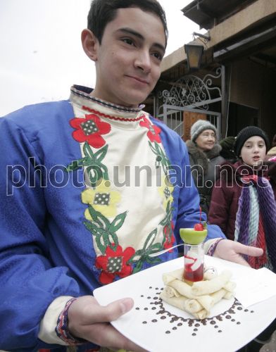 Учасник фестивалю млинців з нагоди Масляниці демонструє композицію з млинців і коктейля, у Севастополі (Крим), у суботу, 5 березня 2011 р. Замішували тісто, робили начинку і смажили млинці кухарі на площі перед жюрі і глядачами. Жюрі оцінювало костюми кухарів та їхню виставу в оригінальному жанрі - пісні, танці, частушки, а також техніку смаження, оформлення при подаванні та смакові якості млинців. Фестиваль пройде у два тура, перший тур - 5 березня, наступного дня - фінал. Масляниця, сирний тиждень - святковий цикл, що зберігся з язичницьких часів. Обряд пов'язаний з проводами зими і зустріччю весни. Масляниця святкується в останній тиждень перед Великим постом, за сім тижнів до Великодня. Головними атрибутами Масляниці є млинці і народні гуляння. Фото Олексія Сувірова / УНІАН