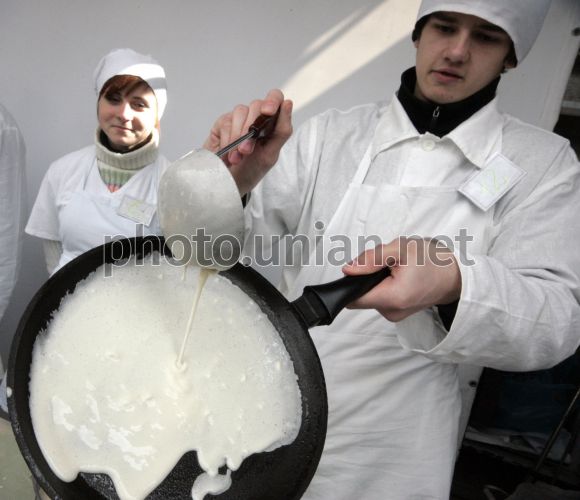 Учасник фестивалю млинців з нагоди Масляниці готує млинці, у Севастополі (Крим), у суботу, 5 березня 2011 р. Замішували тісто, робили начинку і смажили млинці кухарі на площі перед жюрі і глядачами. Жюрі оцінювало костюми кухарів та їхню виставу в оригінальному жанрі - пісні, танці, частушки, а також техніку смаження, оформлення при подаванні та смакові якості млинців. Фестиваль пройде у два тура, перший тур - 5 березня, наступного дня - фінал. Масляниця, сирний тиждень - святковий цикл, що зберігся з язичницьких часів. Обряд пов'язаний з проводами зими і зустріччю весни. Масляниця святкується в останній тиждень перед Великим постом, за сім тижнів до Великодня. Головними атрибутами Масляниці є млинці і народні гуляння. Фото Олексія Сувірова / УНІАН
