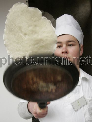 Учасник фестивалю млинців з нагоди Масляниці готує млинці, у Севастополі (Крим), у суботу, 5 березня 2011 р. Замішували тісто, робили начинку і смажили млинці кухарі на площі перед жюрі і глядачами. Жюрі оцінювало костюми кухарів та їхню виставу в оригінальному жанрі - пісні, танці, частушки, а також техніку смаження, оформлення при подаванні та смакові якості млинців. Фестиваль пройде у два тура, перший тур - 5 березня, наступного дня - фінал. Масляниця, сирний тиждень - святковий цикл, що зберігся з язичницьких часів. Обряд пов'язаний з проводами зими і зустріччю весни. Масляниця святкується в останній тиждень перед Великим постом, за сім тижнів до Великодня. Головними атрибутами Масляниці є млинці і народні гуляння. Фото Олексія Сувірова / УНІАН