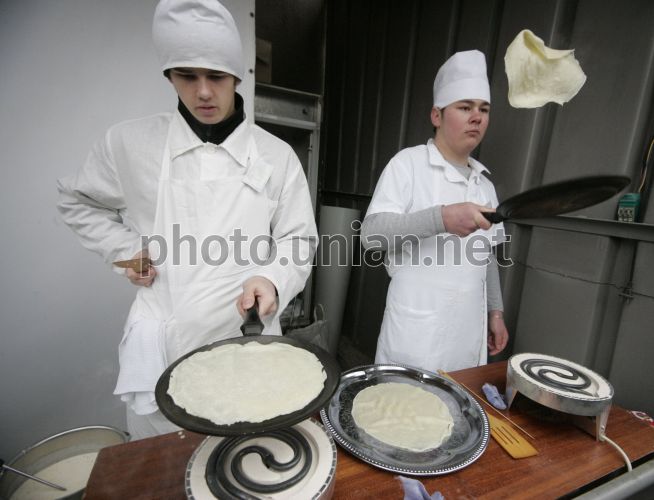 Учасники фестивалю млинців з нагоди Масляниці готують млинці, у Севастополі (Крим), у суботу, 5 березня 2011 р. Замішували тісто, робили начинку і смажили млинці кухарі на площі перед жюрі і глядачами. Жюрі оцінювало костюми кухарів та їхню виставу в оригінальному жанрі - пісні, танці, частушки, а також техніку смаження, оформлення при подаванні та смакові якості млинців. Фестиваль пройде у два тура, перший тур - 5 березня, наступного дня - фінал. Масляниця, сирний тиждень - святковий цикл, що зберігся з язичницьких часів. Обряд пов'язаний з проводами зими і зустріччю весни. Масляниця святкується в останній тиждень перед Великим постом, за сім тижнів до Великодня. Головними атрибутами Масляниці є млинці і народні гуляння. Фото Олексія Сувірова / УНІАН