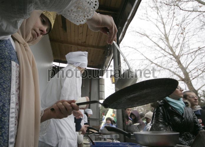 Учасниця фестивалю млинців з нагоди Масляниці готує млинці, у Севастополі (Крим), у суботу, 5 березня 2011 р. Замішували тісто, робили начинку і смажили млинці кухарі на площі перед жюрі і глядачами. Жюрі оцінювало костюми кухарів та їхню виставу в оригінальному жанрі - пісні, танці, частушки, а також техніку смаження, оформлення при подаванні та смакові якості млинців. Фестиваль пройде у два тура, перший тур - 5 березня, наступного дня - фінал. Масляниця, сирний тиждень - святковий цикл, що зберігся з язичницьких часів. Обряд пов'язаний з проводами зими і зустріччю весни. Масляниця святкується в останній тиждень перед Великим постом, за сім тижнів до Великодня. Головними атрибутами Масляниці є млинці і народні гуляння. Фото Олексія Сувірова / УНІАН