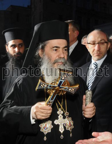 Патріарх Єрусалимський Феофіл (Теофіл) III тримає хрест в Покровському монастирі, в Харкові, в неділю, 27 березня 2011 р. Патріарх Єрусалимський Феофіл III прибув з коротким візитом до Харкова, щоб привітати митрополита Никодима з його 90-річчям. Патріарх Єрусалимський Феофіл III відвідає Київ 28-29 березня, де візьме участь у міжконфесійної конференції. Мета конференції - об'єднання зусиль основних релігійних конфесій та громадянського суспільства в боротьбі з головними викликами двадцять першого століття - екстремізмом, ненавистю, нетерпимістю, ксенофобією. Це перший в історії України візит предстоятеля Єрусалимської православної церкви. Фото Володимира Андреєва / УНІАН