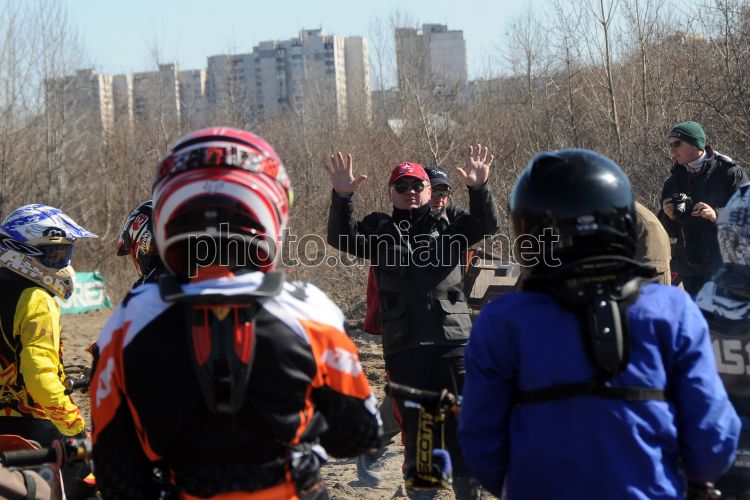 Суддя випускає мотоциклістів на гоночну трасу під час тренувального заїзду змагань з мотокросу третього етапу на Кубок "Люботин Мото" перед стартом в Харкові, в неділю, 27 березня 2011 р. У змаганнях взяли участь 45 мотоциклістів. Фото Володимира Андреєва / УНІАН