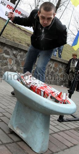 Учасник акції "Україна без "Тютюнового " диму" плює в унітаз, набитий тютюновими виробами, біля будівлі Кабінету Міністрів України, в Києві, у п'ятницю, 31 березня 2011 р. Акція протесту, в якій взяли участь близько 30 осіб, відбулася з вимогою відправити міністра освіти Дмитра Табачника до відставки. Фото Олександра Косарєва / POOL / УНІАН