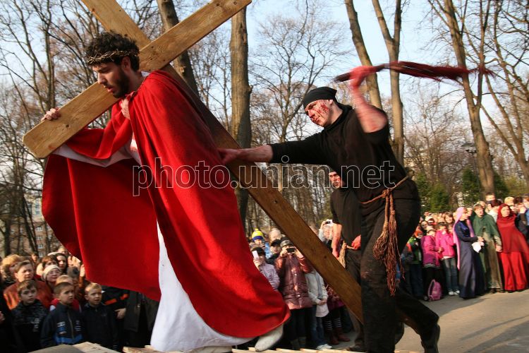 Учасник театралізованої хресної ходи в образі Ісуса Христа несе хрест в Івано-Франківську, в середу, 6 квітня 2011 р. Духовно пройти дорогою Ісуса Христа на Голгофу було запрошено духовенство, представників міської та обласної влади, студентську молодь та учнів, парафіян храму Святого Юрія Побідоносця, гостей та громадськість Івано-Франківська. Фото Тараса Кашуби / УНІАН