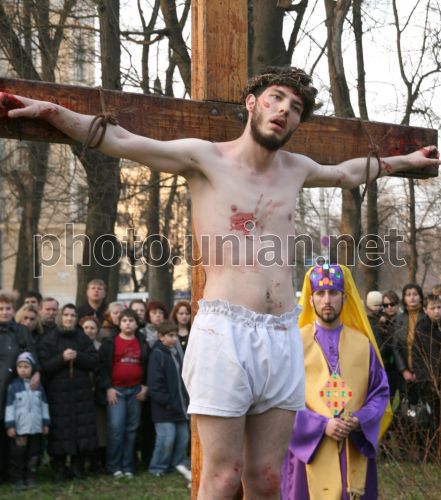 Учасник театралізованої хресної ходи в образі Ісуса Христа на хресті в Івано-Франківську, в середу, 6 квітня 2011 р. Духовно пройти дорогою Ісуса Христа на Голгофу було запрошено духовенство, представників міської та обласної влади, студентську молодь та учнів, парафіян храму Святого Юрія Побідоносця, гостей та громадськість Івано-Франківська. Фото Тараса Кашуби / УНІАН