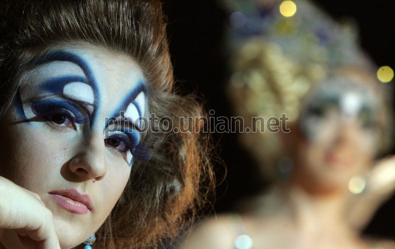 Модель демонструє зачіску під час конкурсу фантазійної зачіски «Театр ілюзій» в рамках Х Фестивалю перукарського мистецтва, моди і дизайну "Кришталевий ангел", в Києві, у четвер, 7 квітня 2011 р. Цього дня відбулося відкриття щорічного фестивалю "Кришталевий ангел", який триватиме до 10 квітня 2011 р. Фото Володимира Гонтара / УНІАН