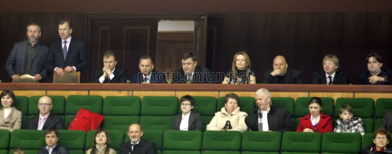 На задньому плані - голова Державної служби молоді і спорту України Равіль Сафіуллін (другий ліворуч), голова Київської міської держадміністрації Олександр Попов (третій ліворуч), віце-прем'єр-міністр - міністр інфраструктури України Борис Колесников (четвертий ліворуч) і голова Державного комітету з питань регуляторної політики і підприємництва Михайло Бродський (третій праворуч) під час урочистого відкриття після реконструкції Палацу спорту, в Києві, у п'ятницю, 15 квітня 2011 р. У Києві відкрито після реконструкції Палац спорту. Завершено лише перший етап технічного переоснащення київського Палацу спорту, який тривав із жовтня минулого року. Оновлення Палацу спорту відбувалося згідно з вимогами Регламенту чемпіонату світу з хокею в першому дивізіоні, де грає і збірна України. Фото Олександра Синиці / УНІАН