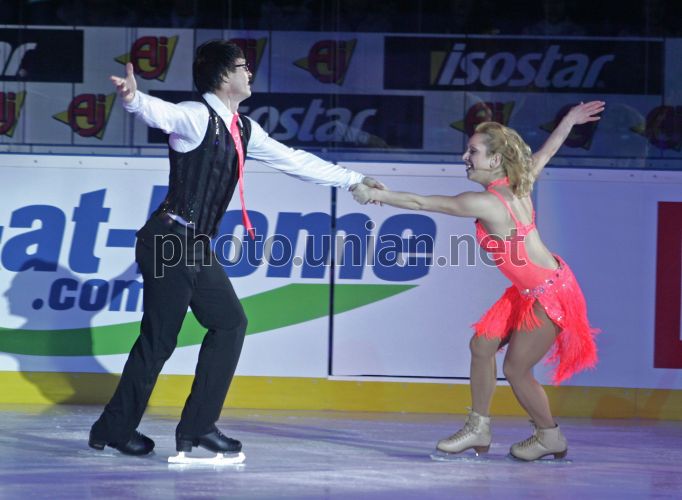 Фігуристи виступають під час церемонії урочистого відкриття після реконструкції Палацу спорту, в Києві, у п'ятницю, 15 квітня 2011 р. У Києві відкрито після реконструкції Палац спорту. Завершено лише перший етап технічного переоснащення київського Палацу спорту, який тривав із жовтня минулого року. Оновлення Палацу спорту відбувалося згідно з вимогами Регламенту чемпіонату світу з хокею в першому дивізіоні, де грає і збірна України. Фото Олександра Синиці / УНІАН