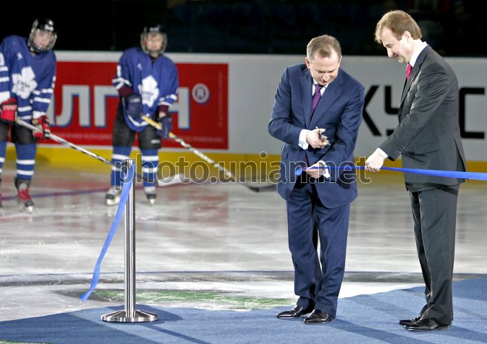 Голова Київської міської держадміністрації Олександр Попов, праворуч, та віце-прем'єр-міністр - міністр інфраструктури України Борис Колесников перерізують стрічку під час церемонії урочистого відкриття після реконструкції Палацу спорту, в Києві, у п'ятницю, 15 квітня 2011 р. У Києві відкрито після реконструкції Палац спорту. Завершено лише перший етап технічного переоснащення київського Палацу спорту, який тривав із жовтня минулого року. Оновлення Палацу спорту відбувалося згідно з вимогами Регламенту чемпіонату світу з хокею в першому дивізіоні, де грає і збірна України. Фото Олександра Синиці / УНІАН