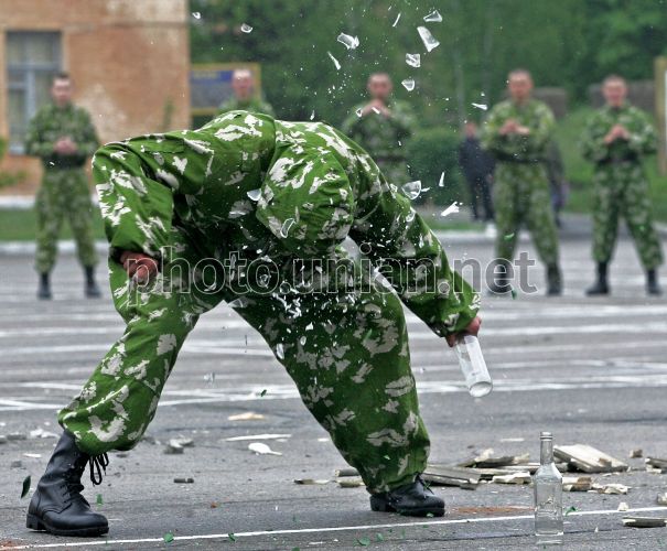 Бійці 101-ї окремої бригади охорони Генерального штабу Збройних Сил України під час показових виступів групи рукопашного бою школи Кунг-фу і Муей Тай Тріратна Чорна Пантера, в Києві, в суботу, 7 травня 2011 р. Цього дня в101-й окремій бригаді охорони Генерального штабу ЗС України відбувся «День відкритих дверей» з нагоди принесення Військової присяги на вірність Українському народові 211 військовослужбовців рот молодого поповнення. Фото Олександра Синиці / УНІАН