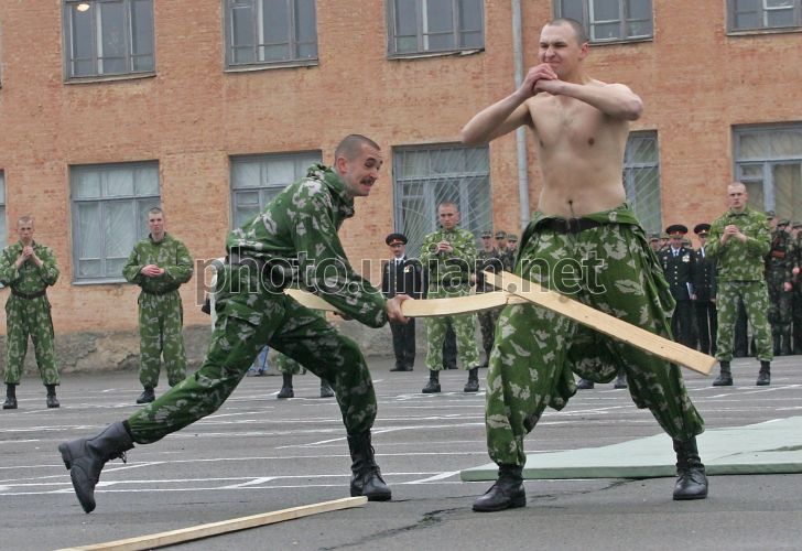 Бійці 101-ї окремої бригади охорони Генерального штабу Збройних Сил України під час показових виступів групи рукопашного бою школи Кунг-фу і Муей Тай Тріратна Чорна Пантера, в Києві, в суботу, 7 травня 2011 р. Цього дня в101-й окремій бригаді охорони Генерального штабу ЗС України відбувся «День відкритих дверей» з нагоди принесення Військової присяги на вірність Українському народові 211 військовослужбовців рот молодого поповнення. Фото Олександра Синиці / УНІАН