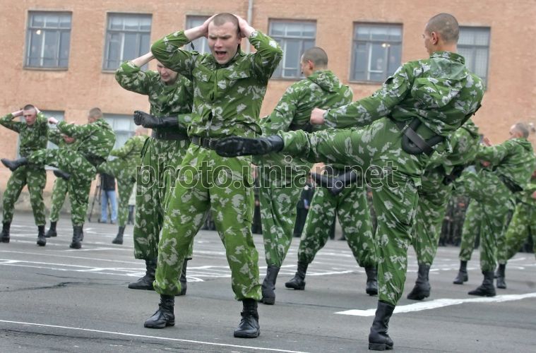 Бійці 101-ї окремої бригади охорони Генерального штабу Збройних Сил України під час показових виступів групи рукопашного бою школи Кунг-фу і Муей Тай Тріратна Чорна Пантера, в Києві, в суботу, 7 травня 2011 р. Цього дня в101-й окремій бригаді охорони Генерального штабу ЗС України відбувся «День відкритих дверей» з нагоди принесення Військової присяги на вірність Українському народові 211 військовослужбовців рот молодого поповнення. Фото Олександра Синиці / УНІАН