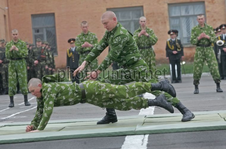 Бійці 101-ї окремої бригади охорони Генерального штабу Збройних Сил України під час показових виступів групи рукопашного бою школи Кунг-фу і Муей Тай Тріратна Чорна Пантера, в Києві, в суботу, 7 травня 2011 р. Цього дня в101-й окремій бригаді охорони Генерального штабу ЗС України відбувся «День відкритих дверей» з нагоди принесення Військової присяги на вірність Українському народові 211 військовослужбовців рот молодого поповнення. Фото Олександра Синиці / УНІАН