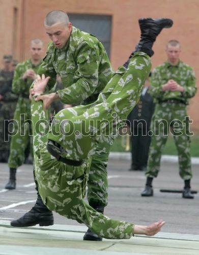 Бійці 101-ї окремої бригади охорони Генерального штабу Збройних Сил України під час показових виступів групи рукопашного бою школи Кунг-фу і Муей Тай Тріратна Чорна Пантера, в Києві, в суботу, 7 травня 2011 р. Цього дня в101-й окремій бригаді охорони Генерального штабу ЗС України відбувся «День відкритих дверей» з нагоди принесення Військової присяги на вірність Українському народові 211 військовослужбовців рот молодого поповнення. Фото Олександра Синиці / УНІАН