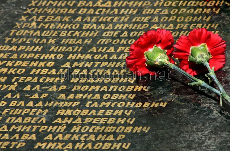 Гвоздики на могилі загиблих у Великій Вітчизняній війні солдат на Пагорбі Слави в день 66-ї річниці Перемоги, в Ужгороді, у понеділок, 9 травня 2011 р. Фото Яноша Немеша / УНІАН