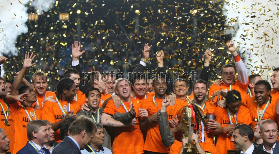 Команда ФК "Шахтар" (Донецьк) фотографується з виграним Кубком України 2010/2011 після перемоги "Шахтаря" у фінальному матчі Кубка України з футболу та церемонії нагородження в Сумах, ввечері в середу, 25 травня 2011 р . Внизу праворуч президент Федерації футболу України (ФФУ) Григорій Суркіс, ліворуч власник ФК "Шахтар" Рінат Ахметов. У центрі головний тренер "Шахтаря" Мірча Луческу. У цей день "Шахтар" виграв у київського "Динамо" з рахунком 2-0. Голи забили нападники ФК "Шахтар" Едуардо да Сілва (№ 11) та Луїс Адріано (№ 9). Фото Володимира Гонтара / УНІАН