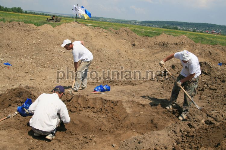 Члени історико-просвітницького товариства "Меморіал" ім. Василя Стуса працюють на розкопках в урочищі Підгородище біля с. Пшеничники (Тисменицький р-н Івано-Франківської обл.), в п'ятницю, 3 червня 2011 р. Під час розкопок масових поховань жертв НКВС, які розпочалися ще минулого року, було виявлено понад 400 скелетів, кожен п’ятий - дитячий. Це масове поховання жертв комуністичного терору датується 1940 роком. Старожили села стверджують, що гарнізон, який знаходився у селі, займався похованням в’язнів зі Станіславської, Тисменицької і Тлумацької тюрем. Фото Тараса Кашуби / УНІАН