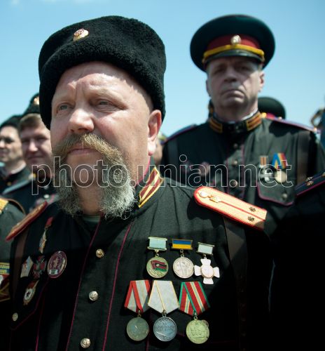 Козак під час традиційної козацької Тризни на острові Хортиця у Запоріжжі, в суботу, 4 червня 2011 р. Цього дня на території острова Хортиця в Запоріжжі відбулися Всеукраїнські змагання з боїв «Лава на лаву» на «Кубок князя Володимира». Взяти в них участь приїхали козацькі підрозділи з різних куточків України і Росії. Перед початком змагань біля музею Запорізького козацтва відбулася козацька Тризна. Присутні вшанували пам'ять всіх козаків, які віддали своє життя за Батьківщину. Після закінчення Тризни, на знак пам'яті про всіх загиблих козаків, на воду був спущений вінок. Фото Олександра Прилепи / УНІАН