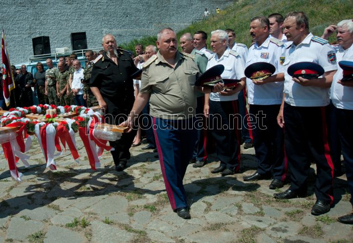 Козаки несуть хрест з вінком і свічками під час церемонії спуску його на воду на традиційній козацькій Тризні на острові Хортиця у Запоріжжі, в суботу, 4 червня 2011 р. Цього дня на території острова Хортиця в Запоріжжі відбулися Всеукраїнські змагання з боїв «Лава на лаву» на «Кубок князя Володимира». Взяти в них участь приїхали козацькі підрозділи з різних куточків України і Росії. Перед початком змагань біля музею Запорізького козацтва відбулася козацька Тризна. Присутні вшанували пам'ять всіх козаків, які віддали своє життя за Батьківщину. Після закінчення Тризни, на знак пам'яті про всіх загиблих козаків, на воду був спущений вінок. Фото Олександра Прилепи / УНІАН