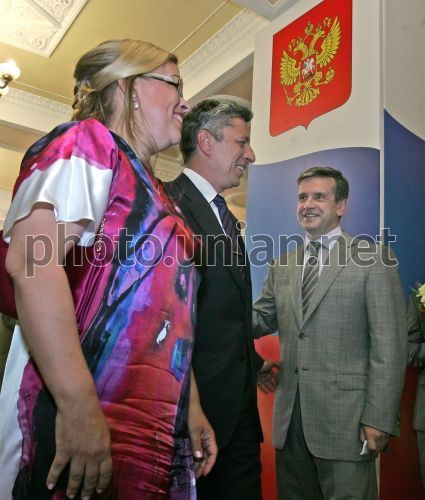 Міністр палива та енергетики України Юрій Бойко зі своєю дружиною Вірою і Повноважний Посол Російської Федерації в Україні Михайло Зурабов (праворуч) вітають один одного під час урочистого прийому з нагоди святкування Дня Росії, у Посольстві Росії в Україні, в Києві, у п'ятницю,10 червня 2011 р. Цього дня у Києві відзначили День Росії. З нагоди державного свята РФ відбувся урочистий прийом, що завершився святковим концертом. Фото Олександра Синиці / УНІАН