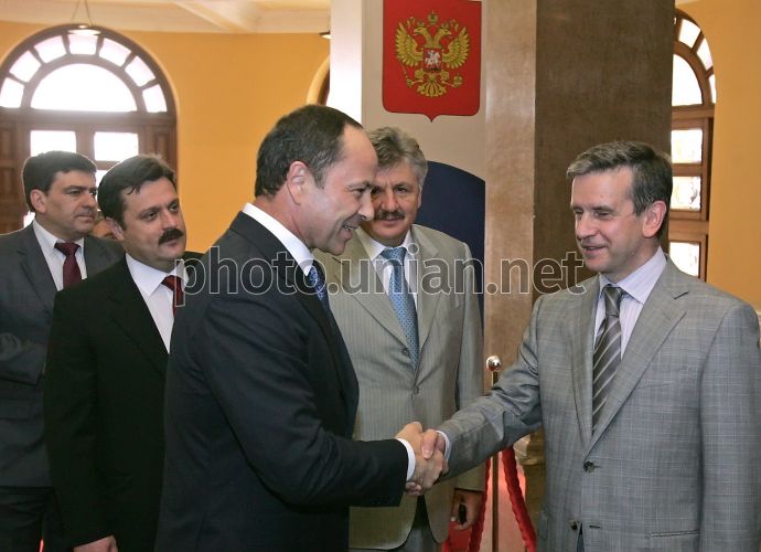 Віце-прем'єр-міністр, міністр соціальної політики Сергій Тігіпко, віце-прем'єр-міністр України Володимир Сівкович і Надзвичайний і Повноважний Посол Російської Федерації в Україні Михайло Зурабов (праворуч) вітають один одного під час урочистого прийому з нагоди святкування Дня Росії, у Посольстві Росії в Україні, в Києві, у п'ятницю,10 червня 2011 р. Цього дня у Києві відзначили День Росії. З нагоди державного свята РФ відбувся урочистий прийом, що завершився святковим концертом. Фото Олександра Синиці / УНІАН