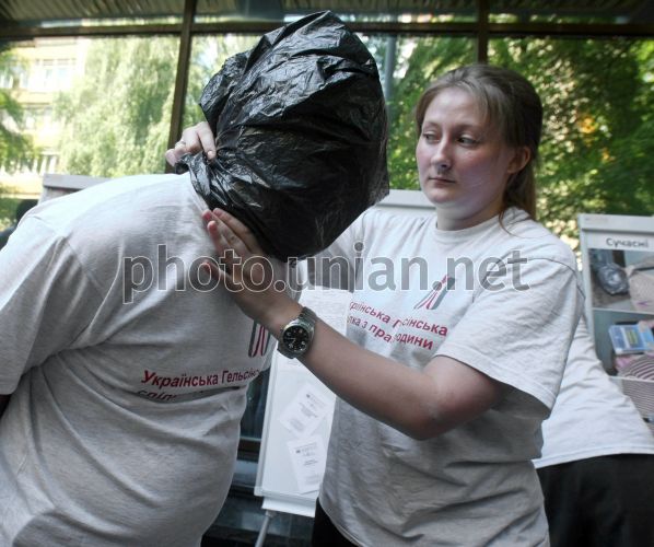 Учасники акції проти тортур, в Києві, в середу, 23 червня 2011 р. Цього дня під стінами Генеральної прокуратури відбулася акція, присвячена Міжнародному дню на підтримку жертв тортур. У рамках акції організатори ознайомили громадян з сучасними знаряддями тортур, які, за їхніми словами, застосовують українські міліціонери. Подібні акції заплановані в Харкові, Сімферополі, Чернігові, Донецьку, Луганську та інших містах України.Міжнародний день у підтримку жертв тортур, проголошений Генеральною Асамблеєю ООН 12 грудня 1997 року, відзначається 26 червня. Тортури - це однo з грубих порушень прав людини, який засуджується всіма міжнародними угодами з прав людини.Фото Володимира Гонтара / УНІАН