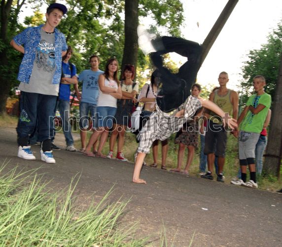 Молода людина танцює брейк в міському парку, в Миколаєві, у четвер, 14 липня 2011 р. Фото Юрія Багрянцева / УНІАН