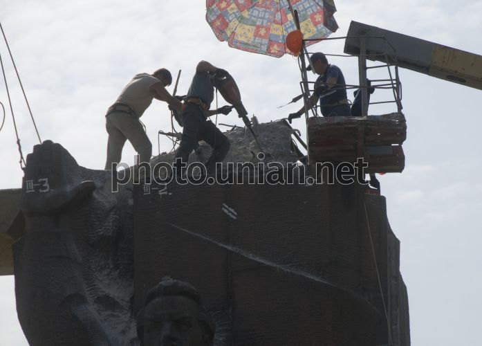 Робочі проводять роботи по демонтажу монумента на честь проголошення радянської влади в Україні на площі Конституції, в Харкові, у вівторок, 19 липня 2011 р. Монумент на честь проголошення радянської влади в Україні буде реконструйовано і перенесено у віддалений промисловий район міста. На місці монумента на площі Конституції буде встановлений пам'ятник «Летюча Україна». На думку вдови скульптора і співавтора пам'ятника Михайла Овсянкіна - монумент не переживе транспортування. Він з граніту, до того ж, в основі фундаменту - монолітна плита, яка не дає вібраціям метрополітену зруйнувати пам'ятник. Фото Володимира Андрєєва / УНІАН
