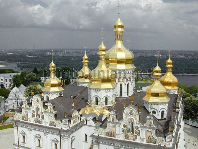 Київ ПРЕС - ФОТО. Вид на бані відновленого Успенського Собору Свято-Успенської Києво-Печерський Лаври. Зведений у 1051р, Успенський Собор був висаджений у листопаді 1941р. під час окупації Києва фашистcкими військами. Реконструкція собору в тому вигляді, у якому він був наприкінці XIX століття, почалася в 1984р. і була закінчена в 1999р. 28 серпня 2001р. практично одночасно зі святкуванням 10-ліття Незалежності України весь християнський світ буде відзначати 950-ліття Києво-Печерської Лаври.